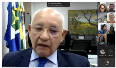 #Paratodosverem. Esta matéria possui recursos de texto alternativo para promover a inclusão das pessoas com deficiência visual. Primeira imagem: Print de tela da reunião  no momento em que o corregedor faz a abertura do curso. Ele está usando um terno azul marinho.
