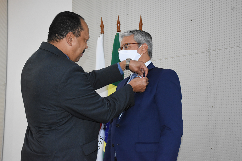 O corregedor Agostinho Gomes de Azevedo condecora o desembargador Paulo Velten (Foto: Mirna de Moura/TJMG )