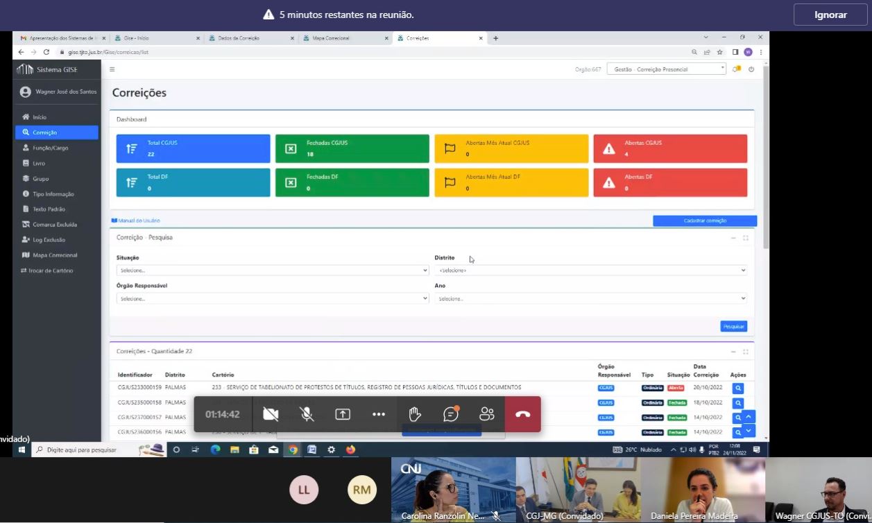Mais transparência aos atos das serventias extrajudiciais, os conhecidos cartórios de registro, este é o principal avanço alcançado por meio do Sistema de Gestão Integrada das Serventias Extrajudiciais – GISE. A ferramenta eletrônica de monitoramento foi Instituída pela Resolução n. 13/2011, já em 2022 recebeu nova regulamentação pelo Provimento nº 12/2022/CGJUS-TO. Os últimos avanços do Gise foram apresentados na última semana (24/11) à Corregedoria Nacional de Justiça (CNJ), representada pela juíza auxiliar da CNJ Daniela Pereira Madeira. O juiz Roniclay Alves de Morais, auxiliar da Corregedoria-Geral da Justiça do Tocantins e supervisor dos Serviços Notariais e de Registro e pelo coordenador Wagner José dos Santos, falaram sobre das principais vantagens do Gise.